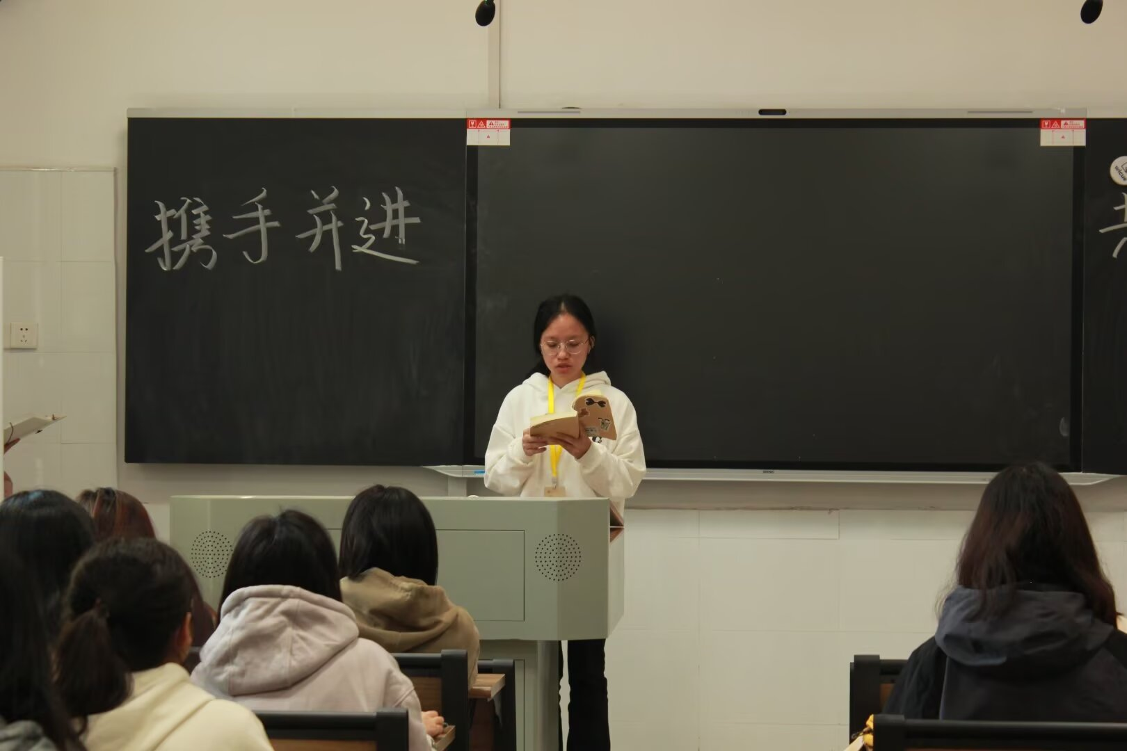 团总支学生副书记宋沁怡就近期各部门工作进行总结发言。她表示,团学成员要及时对各阶段工作进行复盘与反思,注重细节问题,完成好各项工作措施,并及时汇报工作进度,提高团队工作效率。她希望,成员们要培养创新意识,并将创新思想运用于各个活动中,要继续发扬自律自强的精神,以更加积极的态度,迎接新的挑战,为团学的建设贡献一份力量。