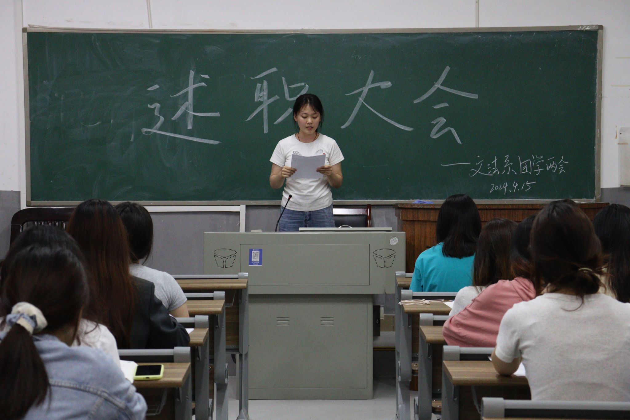 文法系团总支副书记银姿、学生会执行主席曾茜妮、学生会主席团成员杨冰冰以及各部门部长、负责人依次上台进行了述职报告。