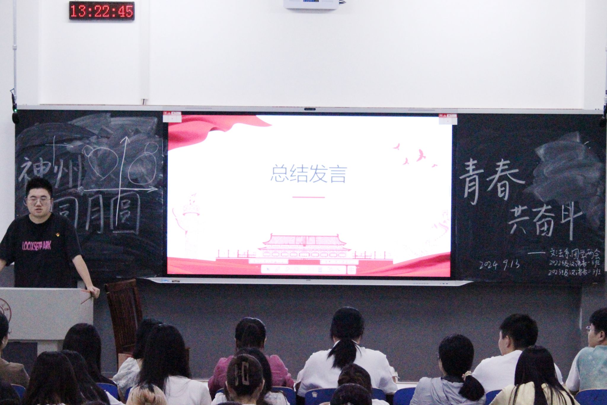 (通讯员 康世强 刘婉婷 周劲翔)9月13日中午,我院文法系团学两会与2022级汉语言文学专业一班、2023级汉语言文学专业二班在树达楼515教室开展以“神州同月圆,青春共奋斗”为主题的团日活动宣讲会。