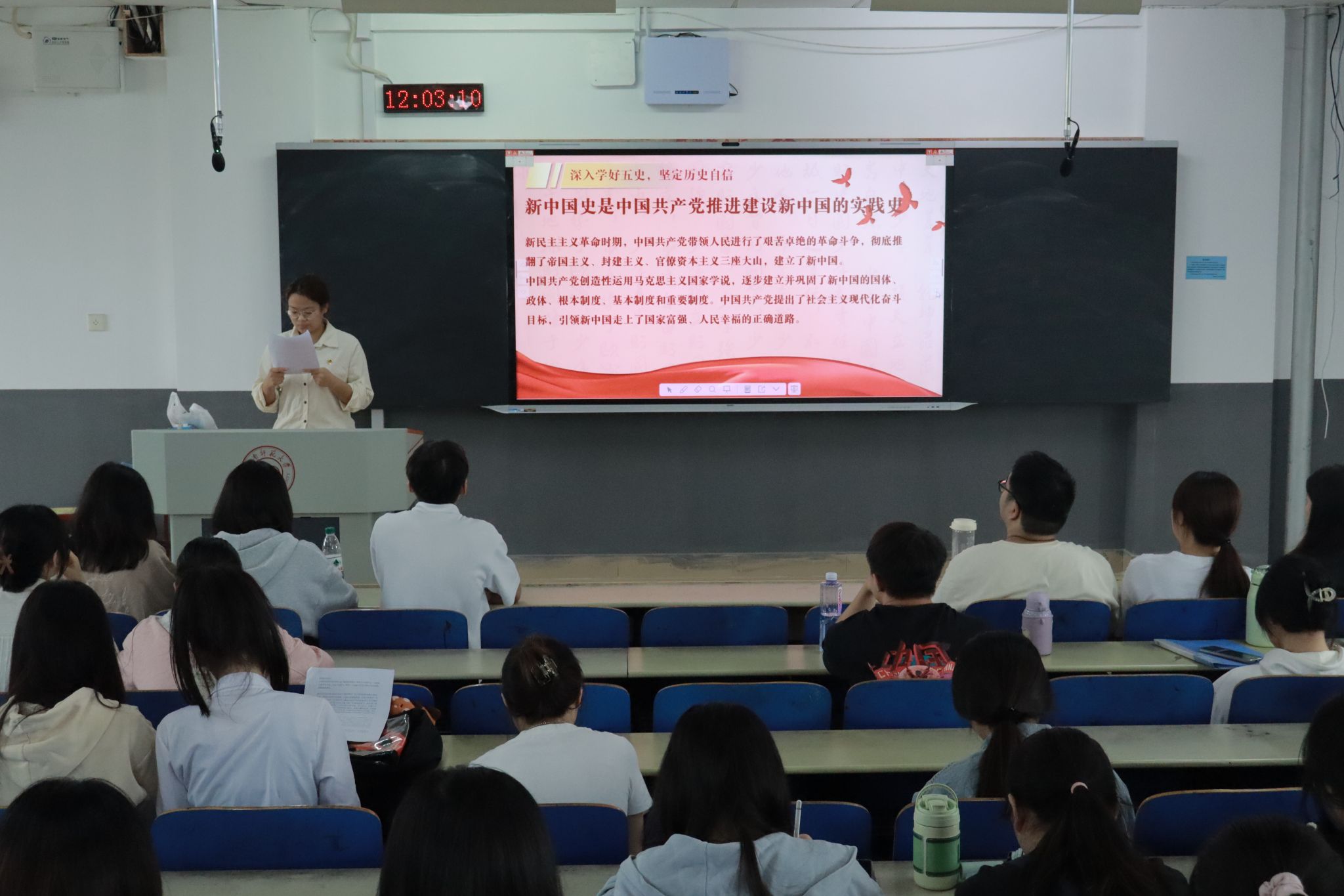 王俊楠围绕“深入学好五史,坚定历史自信”“感悟伟大成就,厚植家国情怀”“坚定跟党奋进,把牢青春航向”“高举爱国旗帜,青春告白祖国”四个主题进行阐述,并组织进行了知识问答,爱国主题朗诵,互动游戏与和唱国歌四个环节。