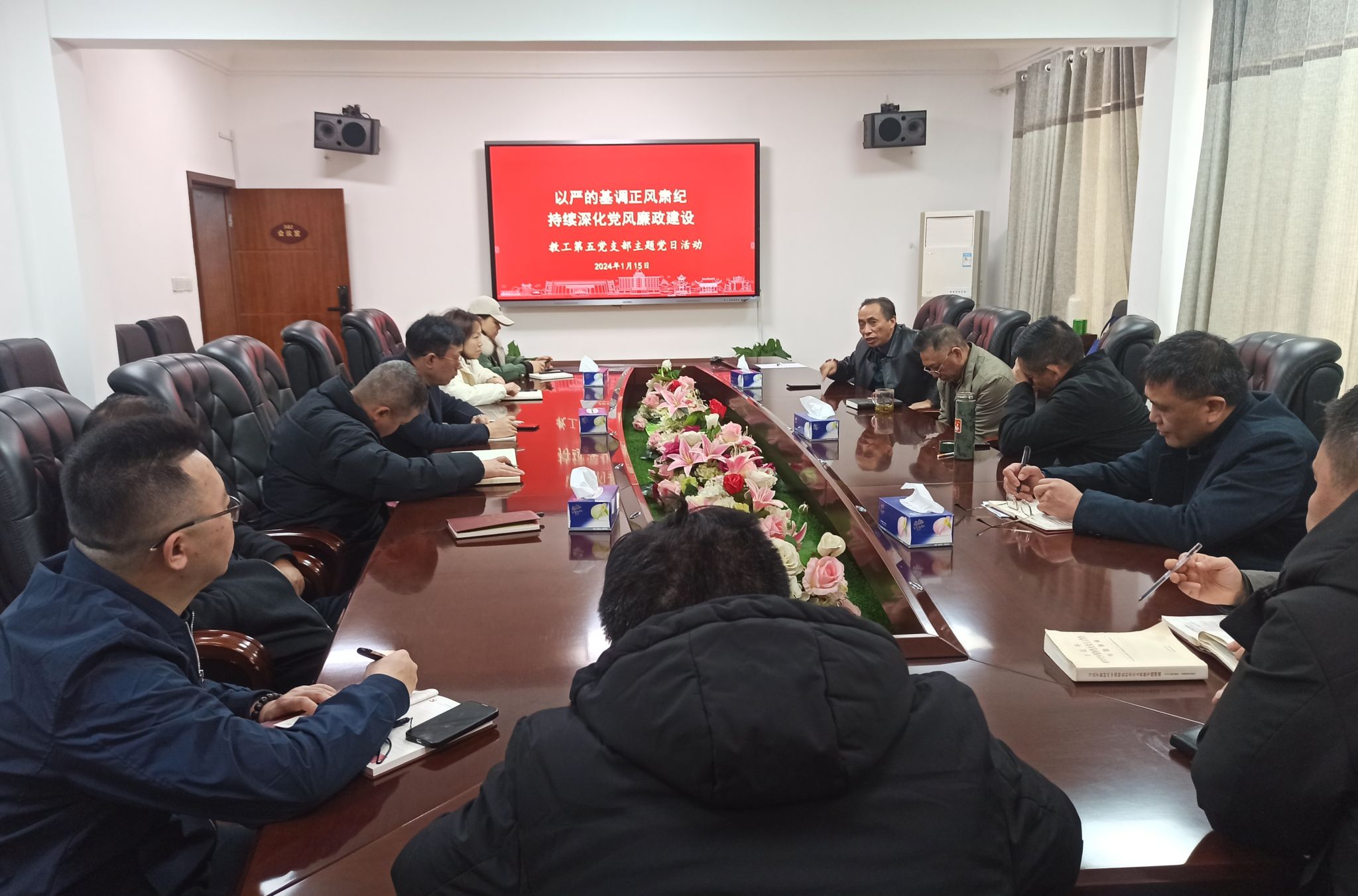 (通讯员 黄蔚)1月15日上午,教工第五党支部在办公楼302会议室开展“以严的基调正风肃纪,持续深化党风廉政建设”主题党日活动。副院长欧阳锡禹以普通党员身份参加活动。活动由支部书记戴著辉主持。