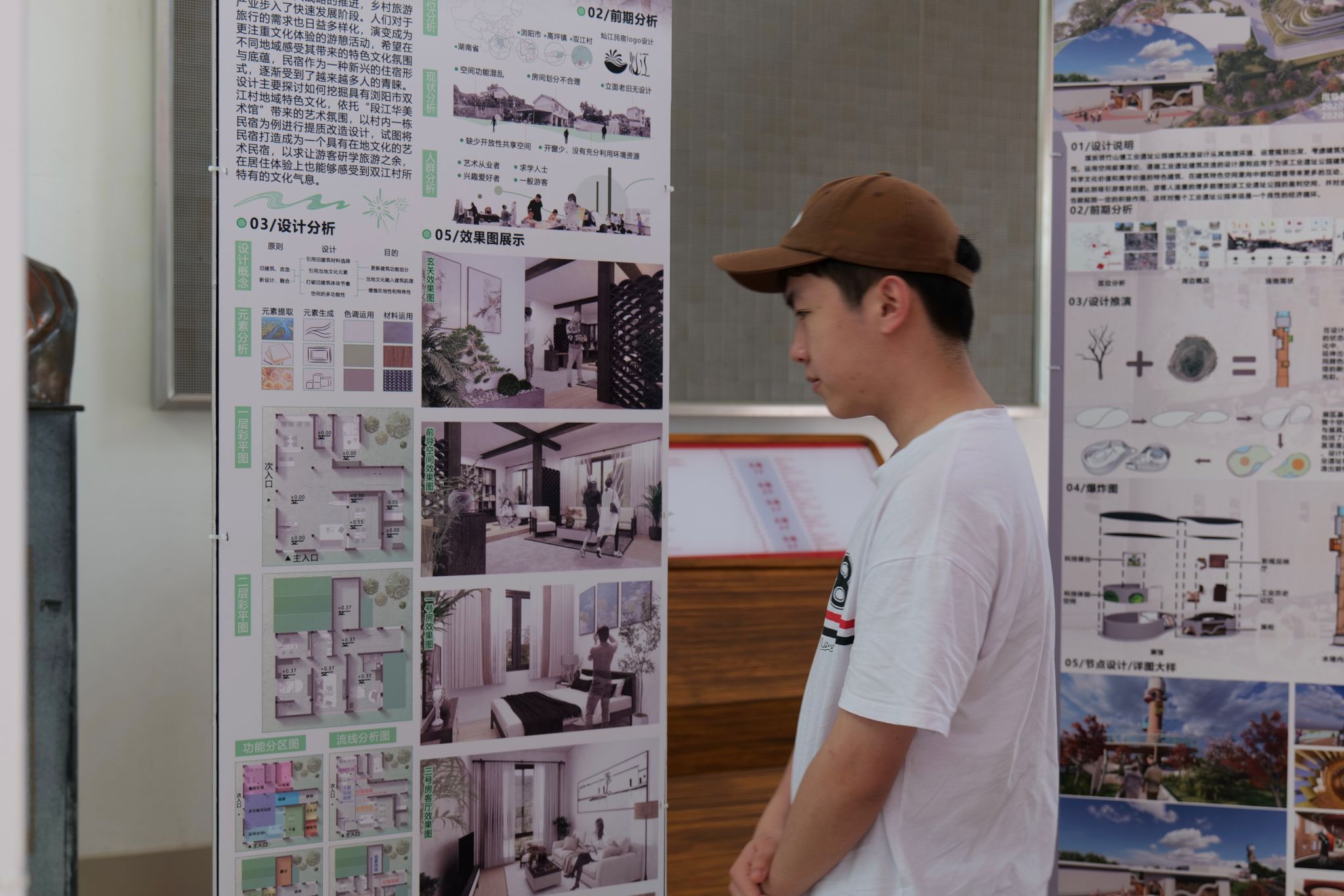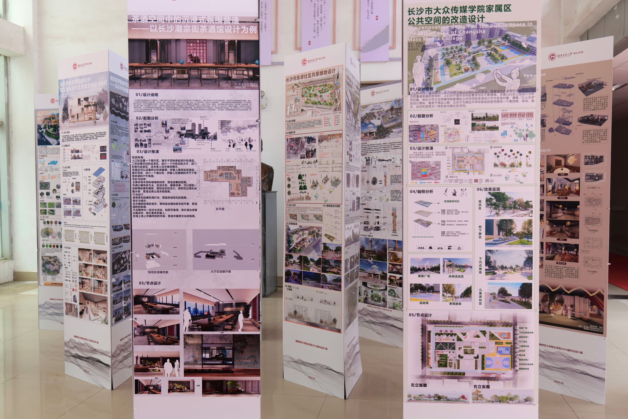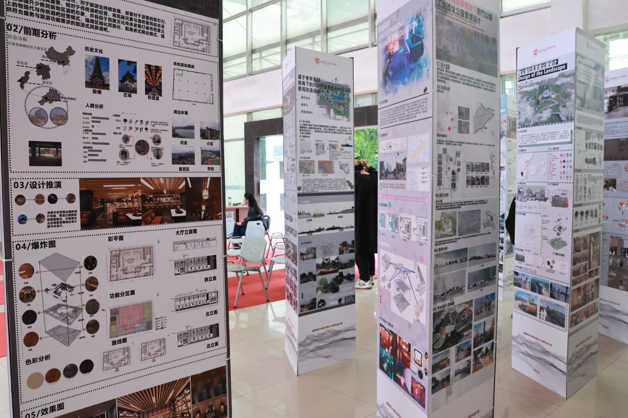展览现场气氛热烈,吸引了众多师生前来参观。毕业展采用三面立体展台设计,确保每一个展示作品都能被全面直观地展现,合理利用空间,提升了观赏体验,增强了展览的互动性和参与感。本次毕业设计作品展共收录27份作品,作品形式丰富,主题多样,视角独特,内容广泛,覆盖了滨江景观道景观空间设计、文化公园景观改造、旧社区合理利用规划等内容,每一件都蕴含着大家的无限创意和深邃思考,充分展现出了树达学子对社会问题的关注、日常生活的热爱和未来美好的憧憬。
