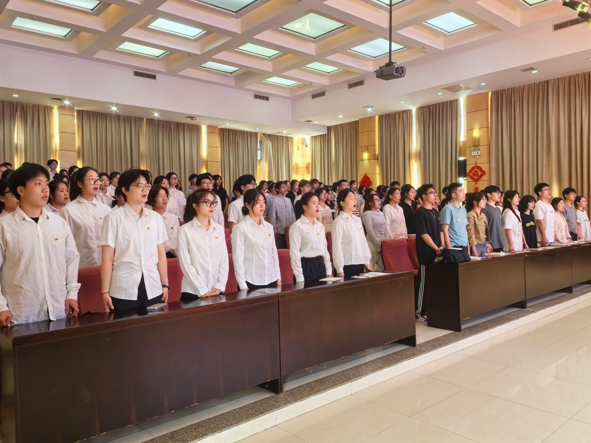 艺体系学生党支部书记陈文鹏领誓,58名新党员面对党旗庄严宣誓。