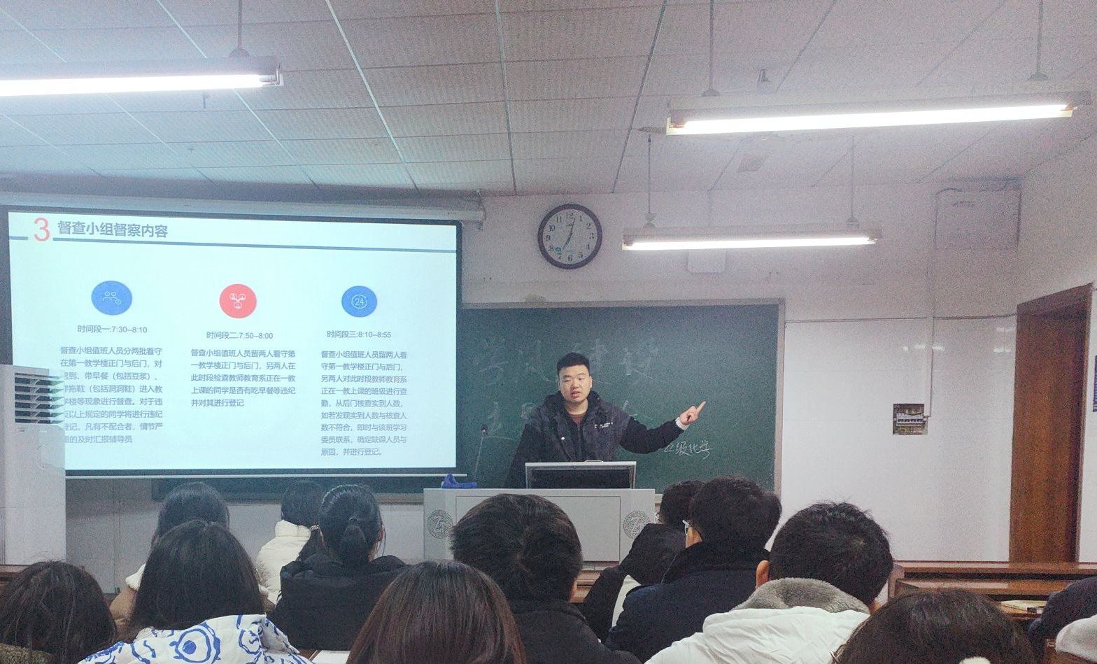 邓裕堃就班级上学期学风建设情况进行总结,并阐述了督察小组的工作内容及相关奖惩制度。他表示,学风建设是高等教育的重要组成部分,对于提高学生综合素质有着深远意义。他强调,作为班集体的一员,大家要努力营造严谨务实的学习氛围,为增强班级荣誉感贡献一份力量。