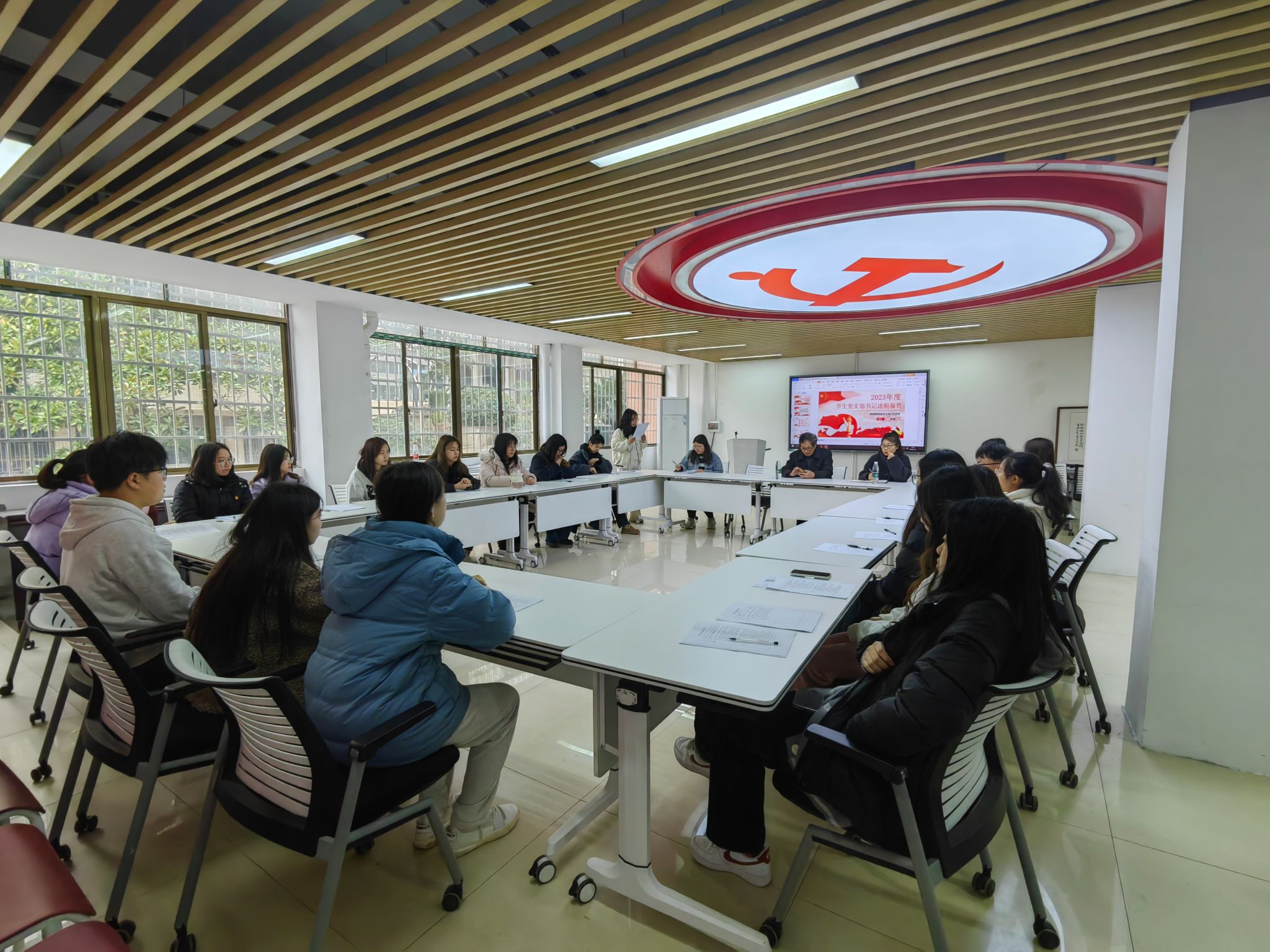 ok138cn太阳集团学生第一党支部书记胡可曼对2023年度工作进行了述职汇报。她从党支部基本情况、推进理论武装、执行上级部署、支部建设、党员管理、学院转设工作等方面详细阐述了支部存在的不足及改进的计划,她表示,今后会继续坚持做好自己,努力带领大家建设更加优秀的党支部。