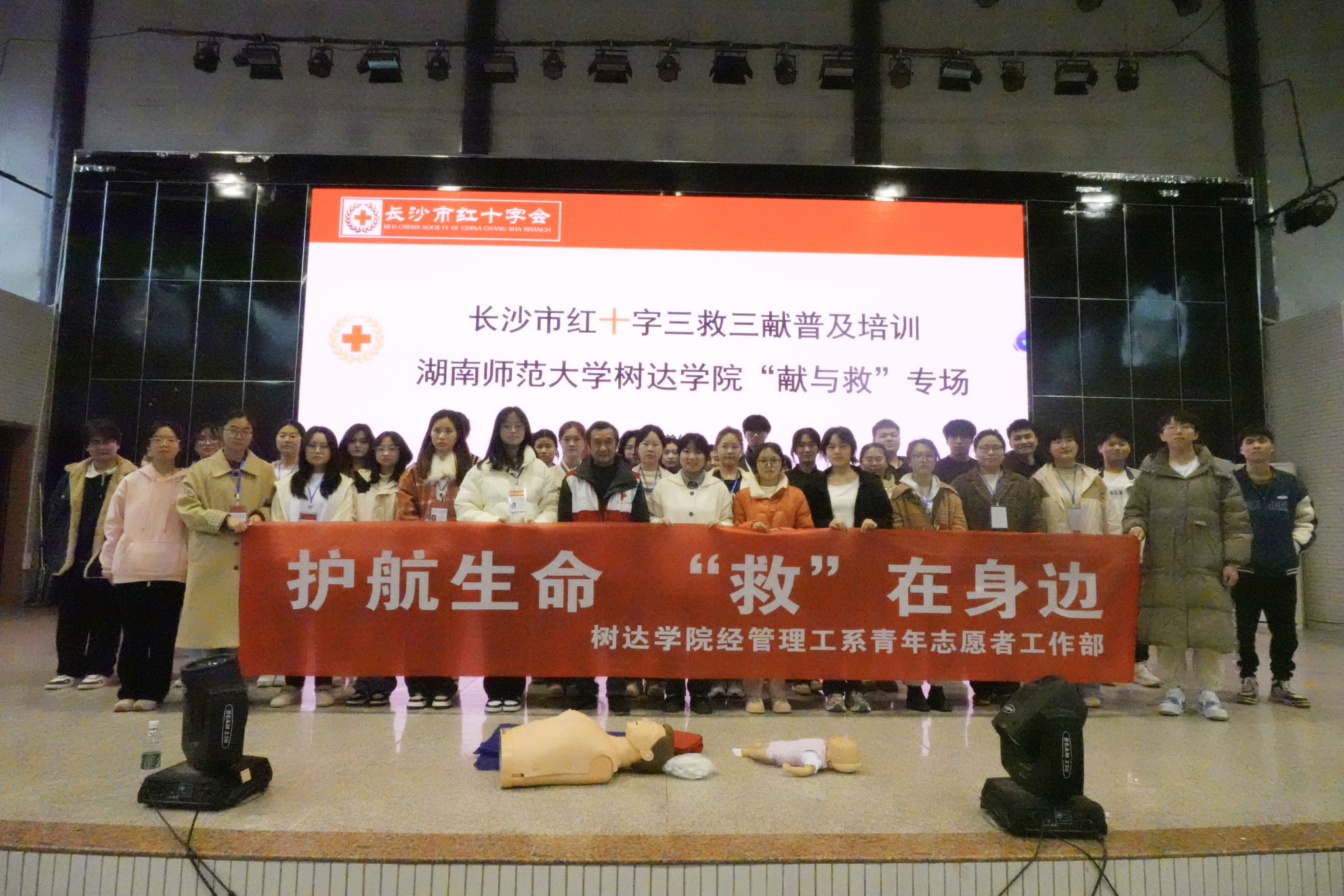 长沙市红十字会急救培训负责人孙怀冬进行授课。她采用理论与现场演练相结合的方式向同学们讲述了急救的重要性和心肺复苏、海姆利克的操作流程,并详细介绍了AED除颤器的使用方法。