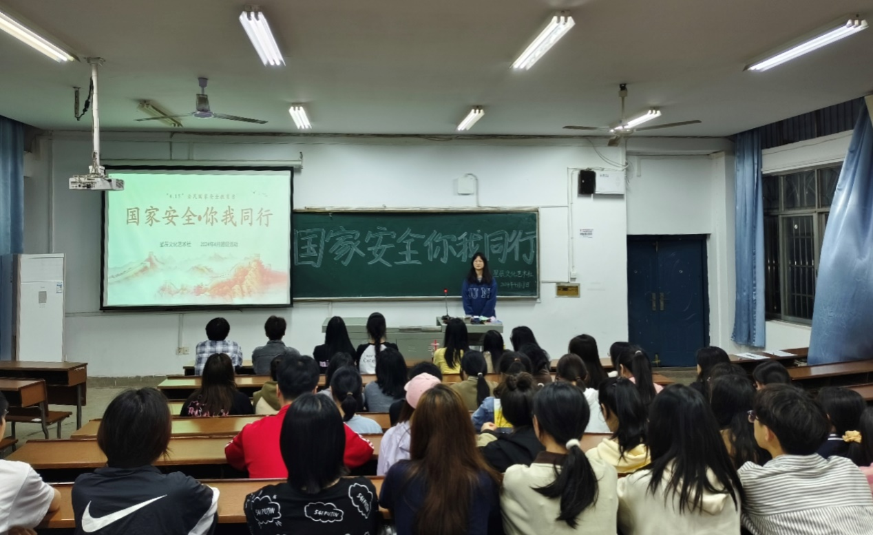 (记者 李博书 赵丙阳 肖熙)4月17日晚,我院星辰文化艺术社张公岭分中心理事会在张公岭校区教学楼北阶梯教室开展“国家安全,你我同行”主题团日活动。活动由星辰文化艺术社张公岭分中心理事黄诗婷主持。