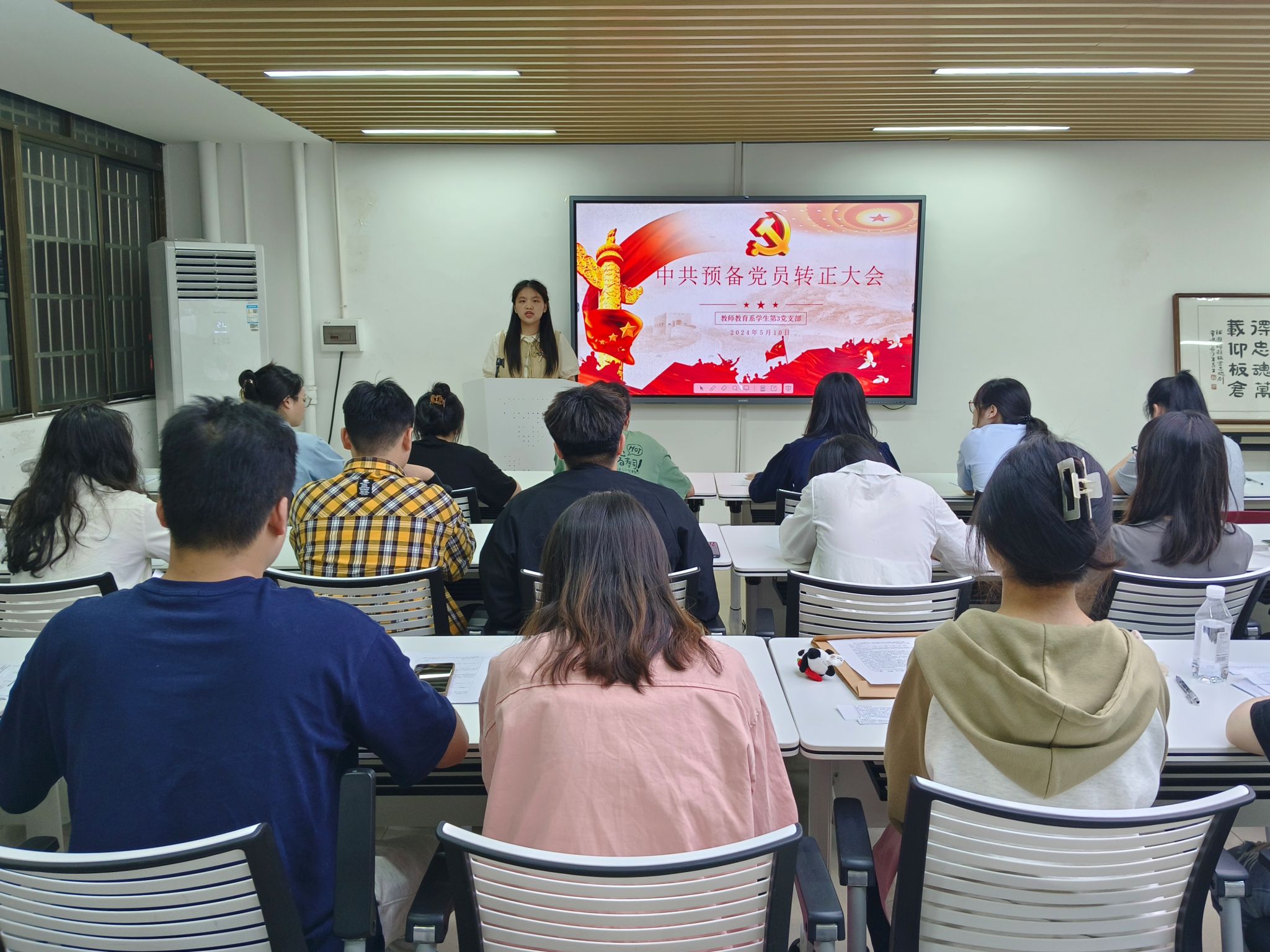 彭乐盈等10名预备党员依次汇报其在预备期一年内的情况,向党组织表明态度和决心,并提出转正申请。