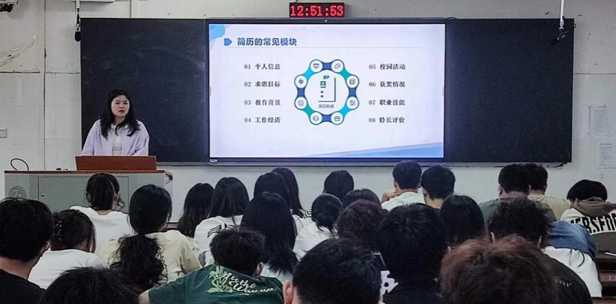 陈蓉以如何写好一份求职简历为切入点,从求职前准备和求职过程两个方面分析了求职策略。她指出,目前就业形势严峻,同学们要明确自身的方向,在求职前应尽量充实自己的应试技能,搜集行业信息,在求职过程中要保持良好的心态。她希望,同学们要树立正确的就业观,积极参与就业相关宣讲会,根据自身优势和专业,选择合适的岗位,面试中要自信展示自己,以平和的心态应对求职挑战。