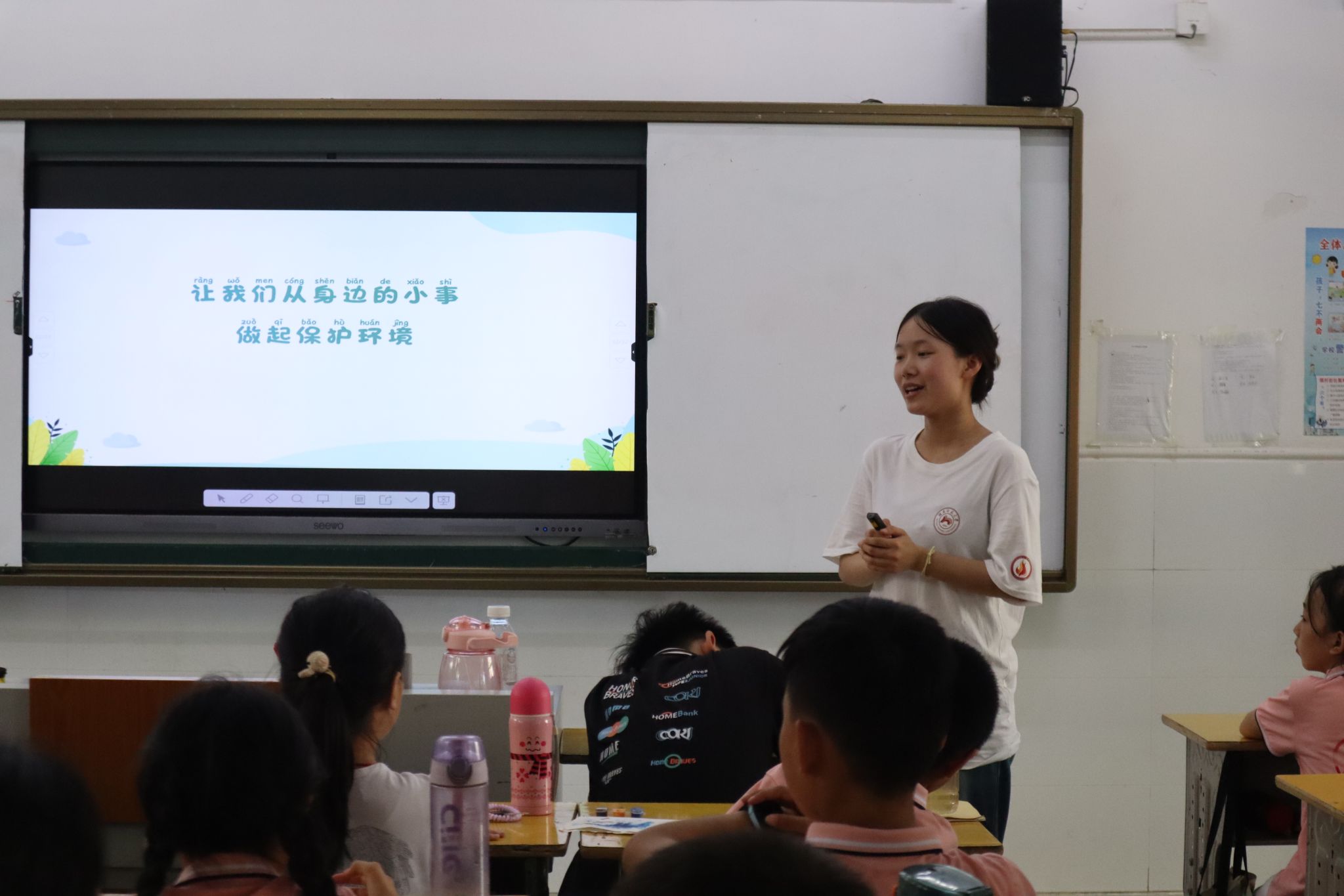 彭雨馨以“环境保护”为核心,系统地从“为什么要保护环境”“环保措施”“我是环保小卫士”三个板块展开讲解,让学生学到实用的环保知识,还能深刻认识到环保的重要性。