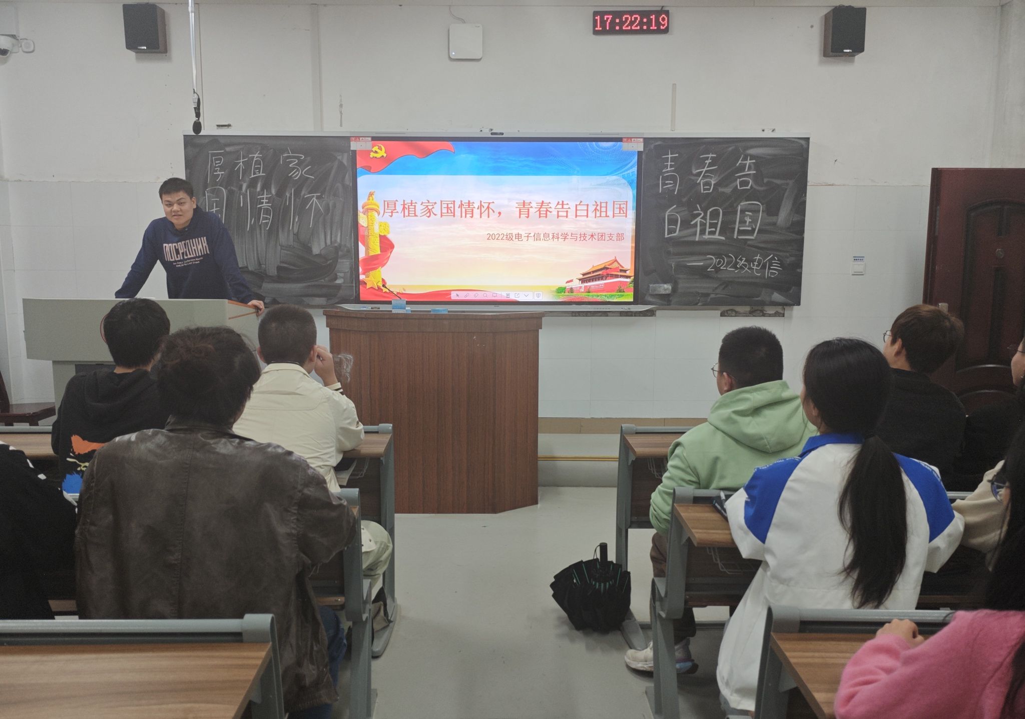 (通讯员 叶俊杰 胡洋)10月14日下午,我院理工系2022级电子信息科学与技术专业在树达楼105教室开展以“厚植家国情怀,青青告白祖国”为主题的团日活动。活动由团支部书记王杰主持。