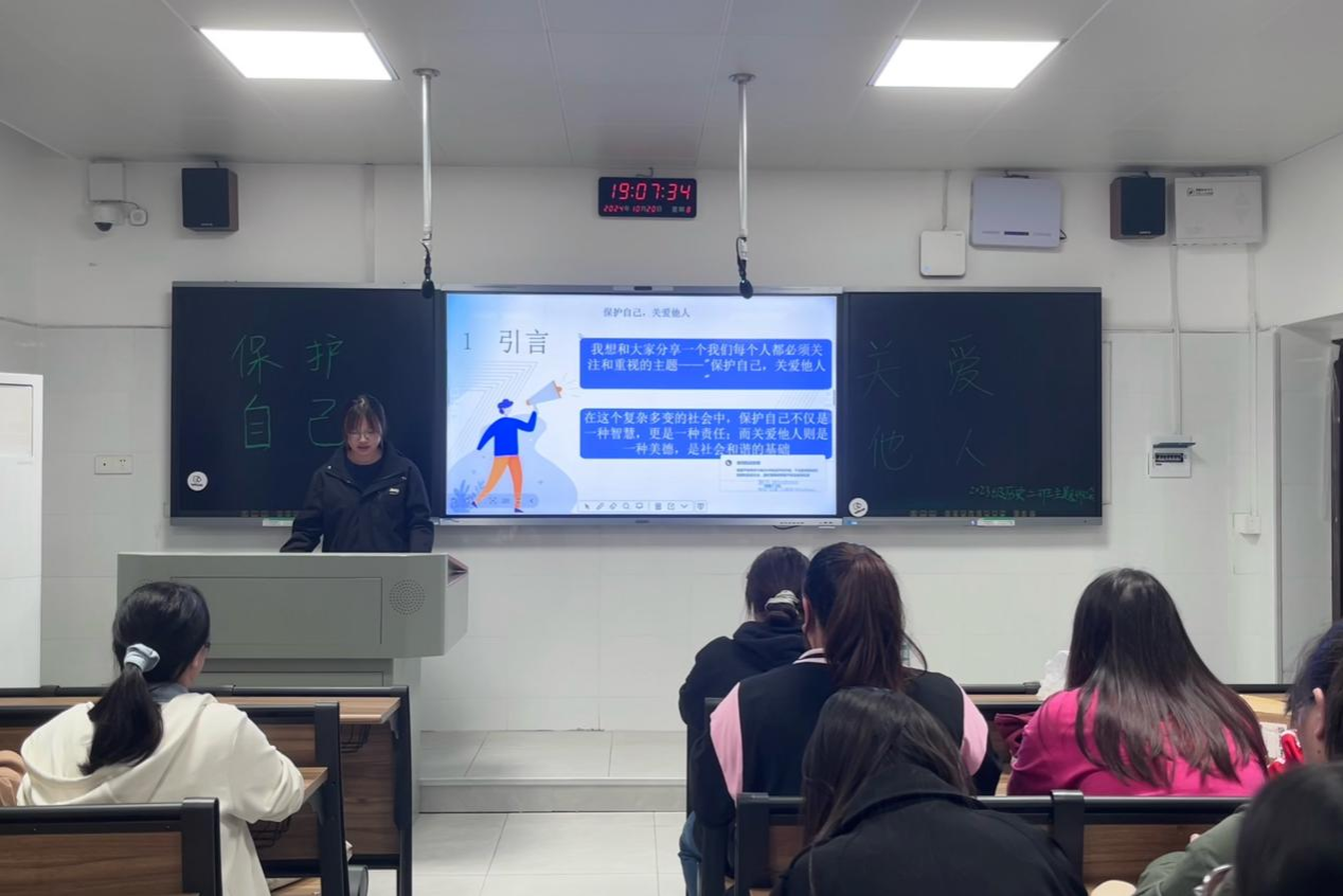 (通讯员 全奕 吴家曦 洪鹏志)10月20日晚,我院ok138cn太阳集团2023级历史学专业二班于第一教学楼314教室开展“保护自己,关爱他人”主题班会。班会由安全委员周婷和心理委员杨芳怡主持。