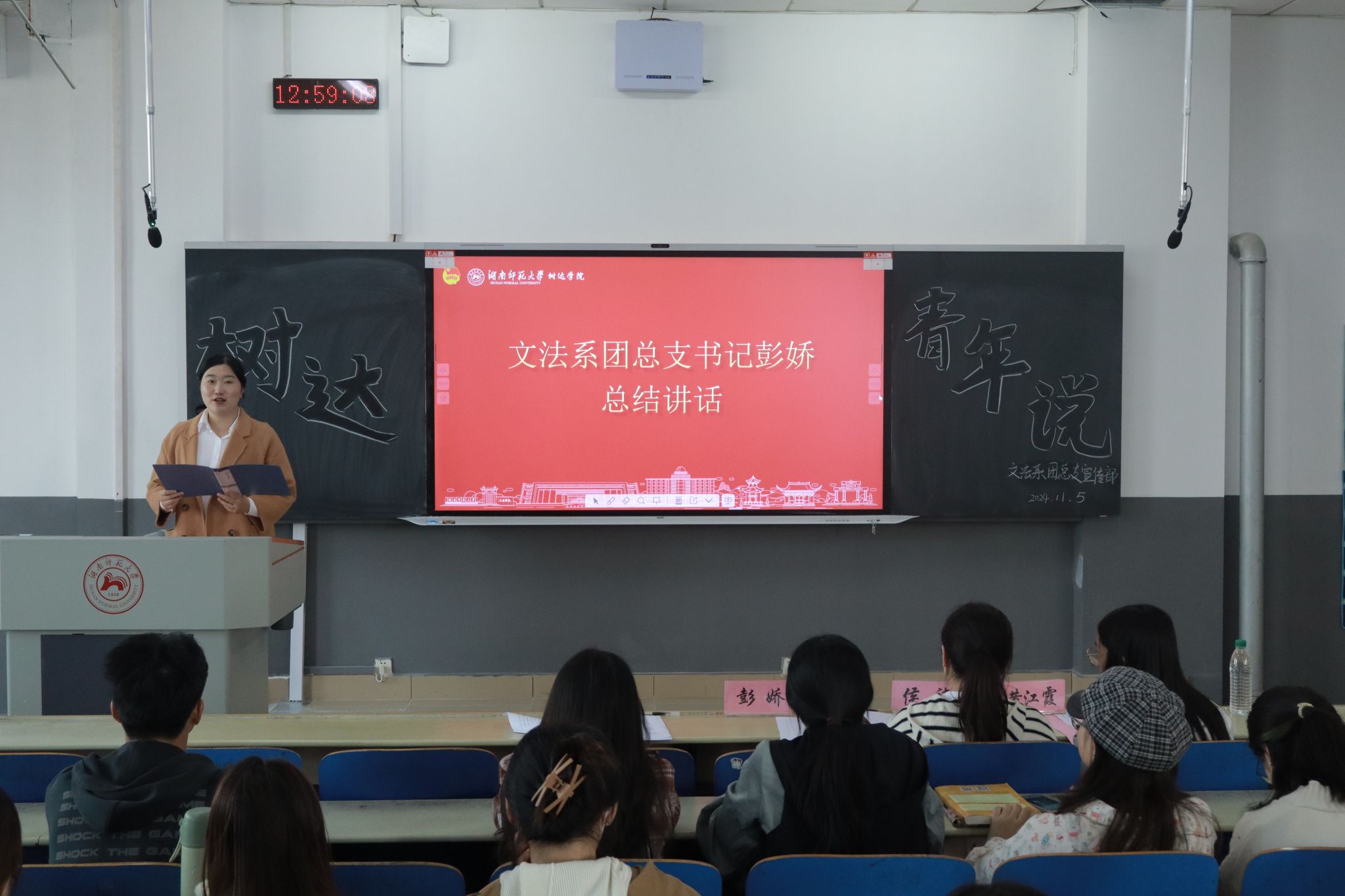 文法系团总支书记彭娇对各位主讲人的演讲进行点评。她表示,每位主讲人都展现了自我风采,但演讲应更有激情,要多加锻炼。她希望同学们能够敢想、敢当、敢做,展现在新时代下的青年担当和青年力量。
