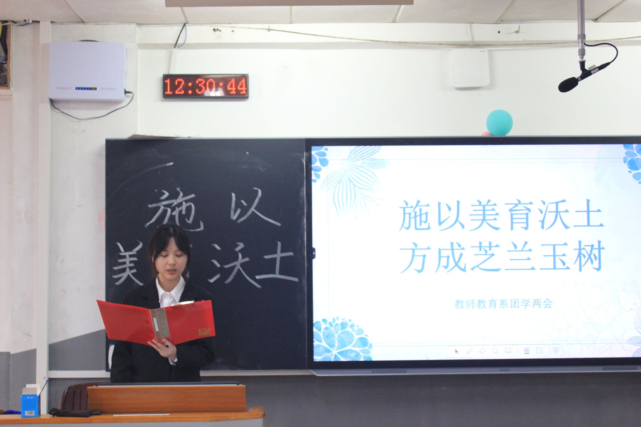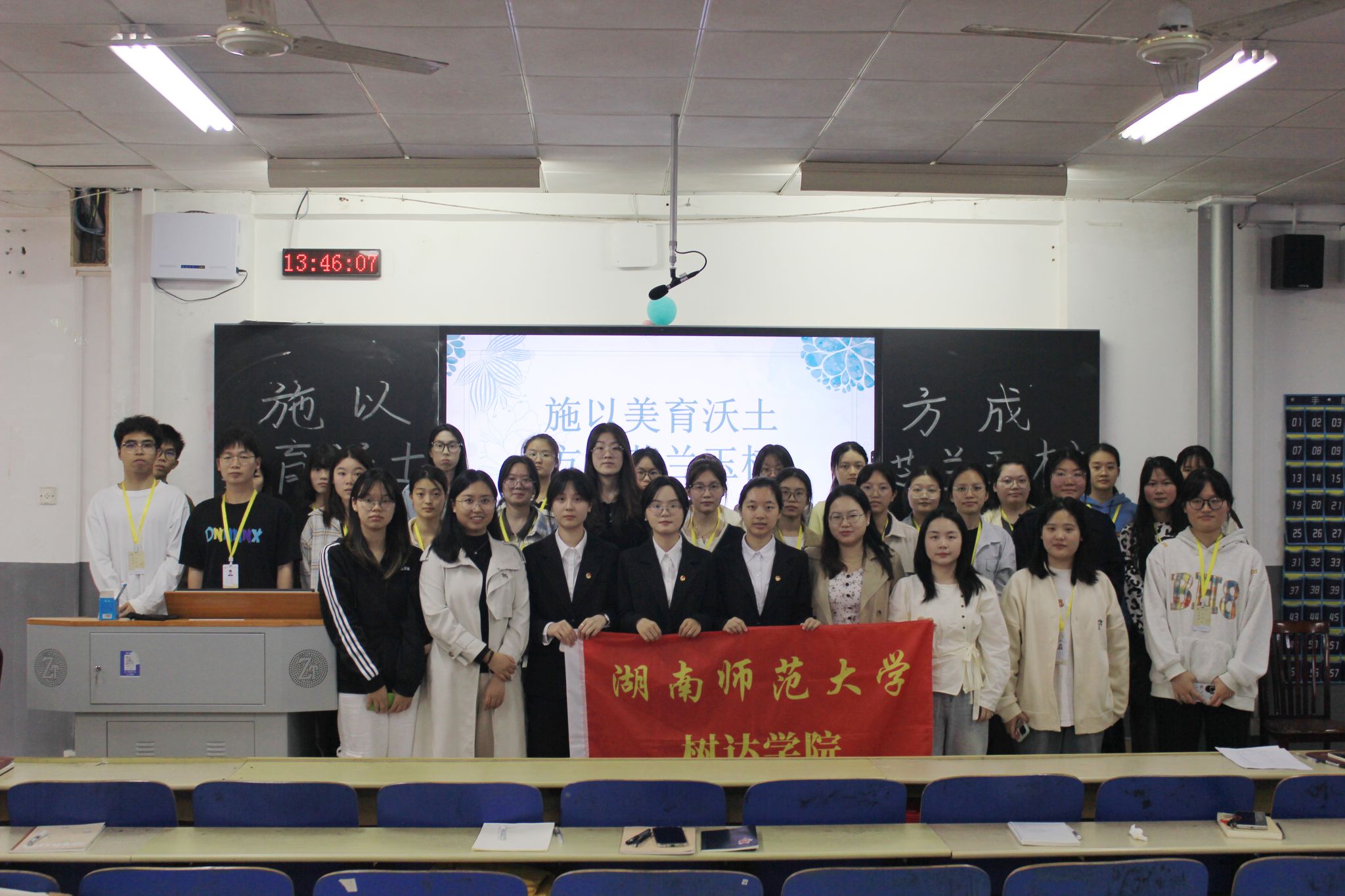 辅导员刘浩月作总结发言。她强调,美育的学习不是一蹴而就,而是需要长时间的滋养。她希望,同学们要在完成学业的前提下去丰富自己的大学生活,寻找机会去接触美育和德育的学习,增强自身的师范技能,实现自我完善和发展。