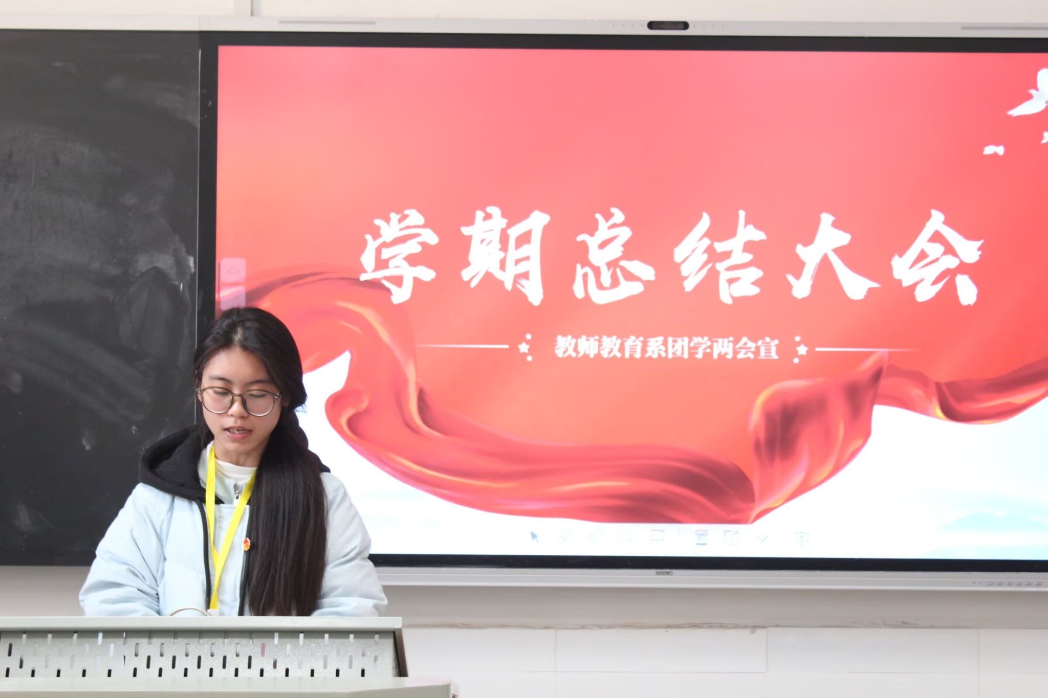 学生会主席团成员贺思宇就学生会本学期工作进行总结,并分享工作感悟。她强调,下一学期的工作需要更加注重活动质量,强化内部的团结协作。她希望,团学成员能够进一步提高工作积极性和主动性,发扬优点,改进不足,努力为同学们提供更好的服务,共同为校园文化建设努力。