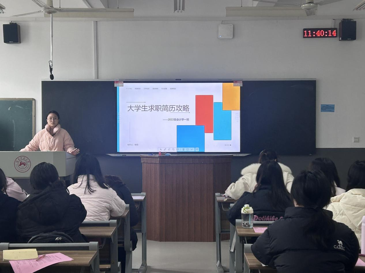 (通讯员 粟思瑾 杨阳 刘媛媛)3月13日下午,我院经管系2022级会计学专业于树达楼404教室开展以“大学生求职简历攻略”为主题的班会。经管系辅导员王贞出席会议。会议由组织委员杨阳主持。