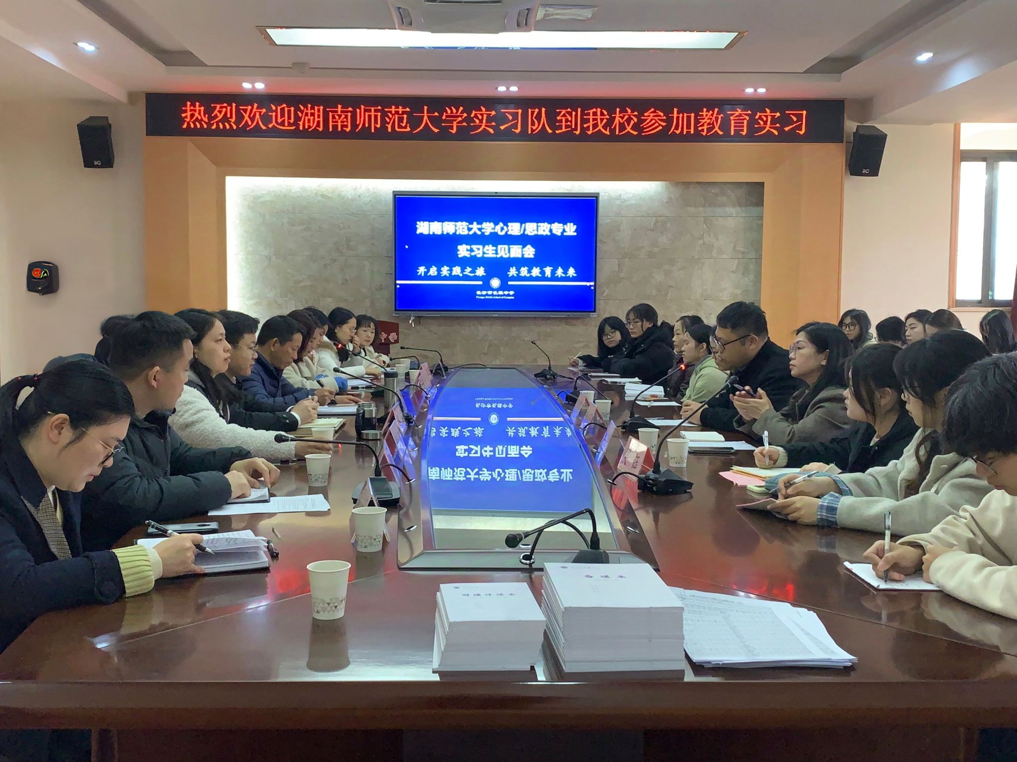 (通讯者 黄雪琴 何悦 焦丹)3月17日上午,我院文法系2022级应用心理学班赴长雅中学实习队于长沙市长雅中学综合楼会议室召开实习见面会。长沙市长雅中学校长黎云、副校长陈振华、教务处主任黄婷、总务处主任张红振,实习指导老师颜志强、彭瑶萍出席会议。会议由长沙市长雅中学党政办主任丁献策主持。