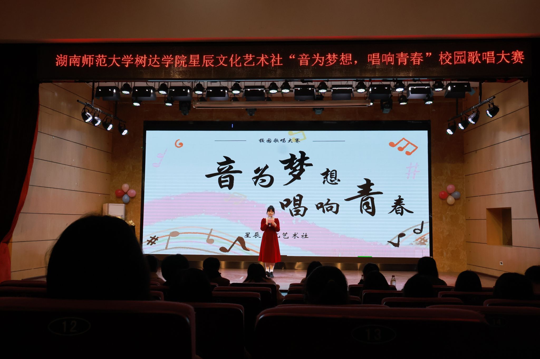 (通讯员 谢先璇 何慧萍 黄好琳)3月19日中午,我院星辰文化艺术社在树达楼113报告厅举办以“音为梦想,唱响青春”为主题的校园歌唱比赛决赛。我院教务办主任刘晗、团委副书记龙珊出席比赛。比赛由2022级播音与主持艺术专业马粤娟主持。