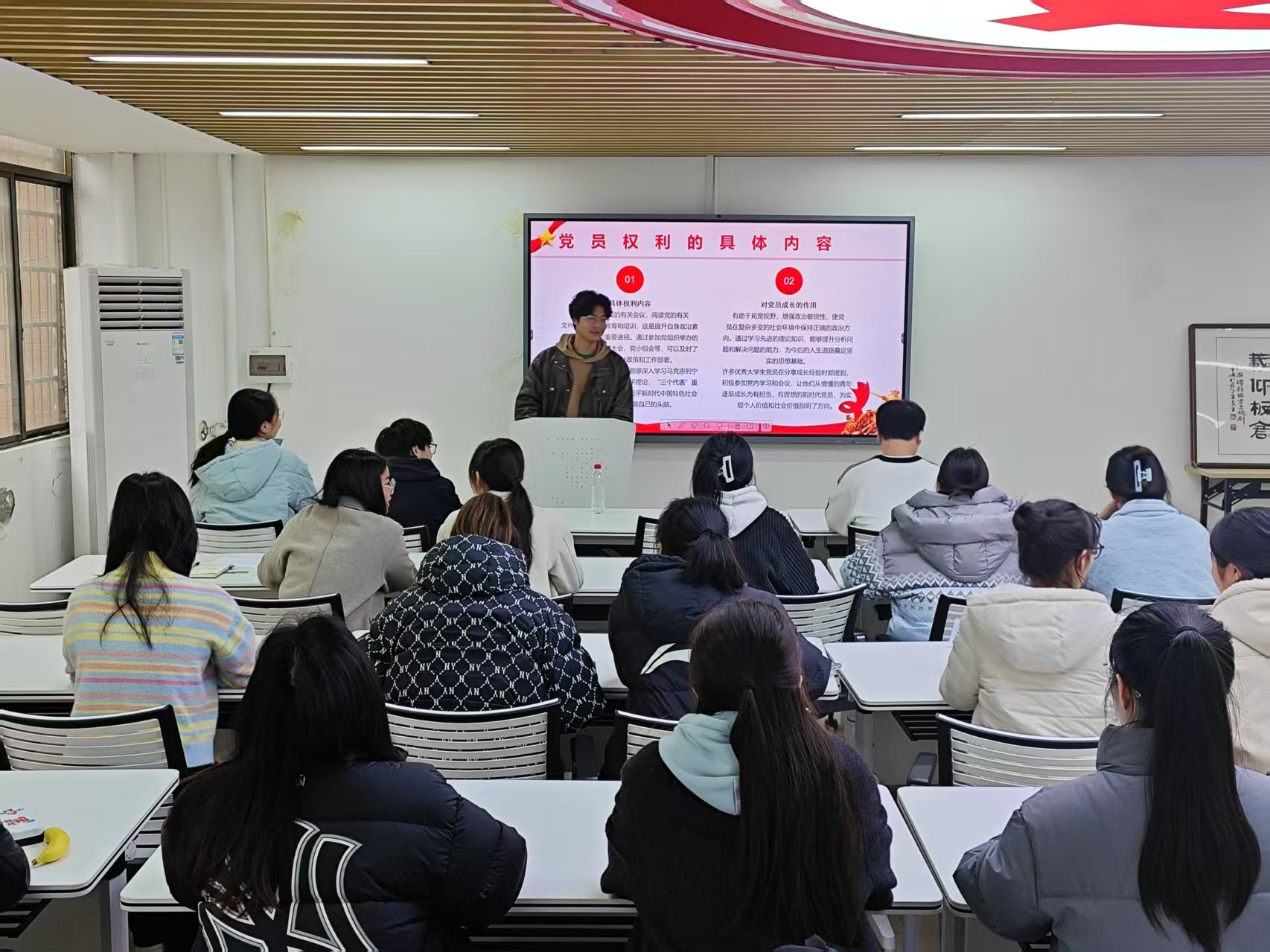 伍家俊围绕党员的义务、党员的权利、违反权利与义务的党员情形三个方面展开讲解。他指出,大学生党员是党的新鲜血液和未来希望,是连接党组织与广大学生的重要桥梁,明确党员的权利与义务是成为合格党员的基础,有助于党员更好地理解党的宗旨和使命,增强党性修养。